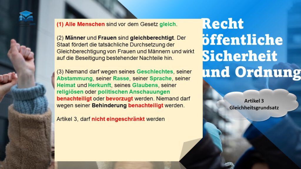 Der Gleichheitsgrundsatz nach Artikel drei beschreibt, dass der Staat gegenüber dem Bürger (und in der Drittwirkung a...